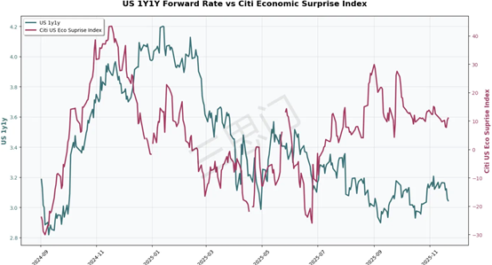 随着股票市场的下跌,美国前端的1y1y利率(下图绿线)也跟着下跌。但是从基本面数据(下图红线,美国经济惊喜指数)来看,美国经济并未下滑,利率大概率也只是跟着市场情绪在走而已。不过,更重要的是,明年前端利率会怎么走?这个问题不但对美股非常重要,对美元甚至黄金也非常重要。