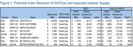 这些公司预计会在明年 2 月被剔除,潜在卖盘规模不小。以 MSTR 为例,最多可能触发 80 亿美元的被动卖盘。但因为 MSTR 的日均交易量本来就大,这相当于 3 天的交易量,并不至于压垮市场。
