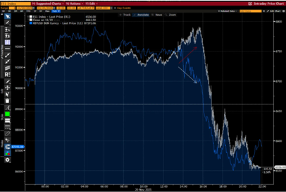 在说一下MSTR。我在周五提到了周四的下跌行情很诡异。在数据和NVDA盈利都不错的情况下,大盘从上涨接近2%到下跌1.5%很诡异,而大饼(下图蓝线)的下跌可能是主导因素。